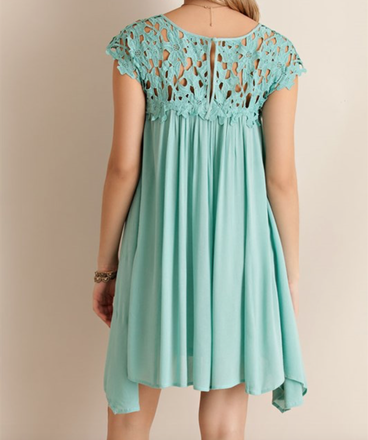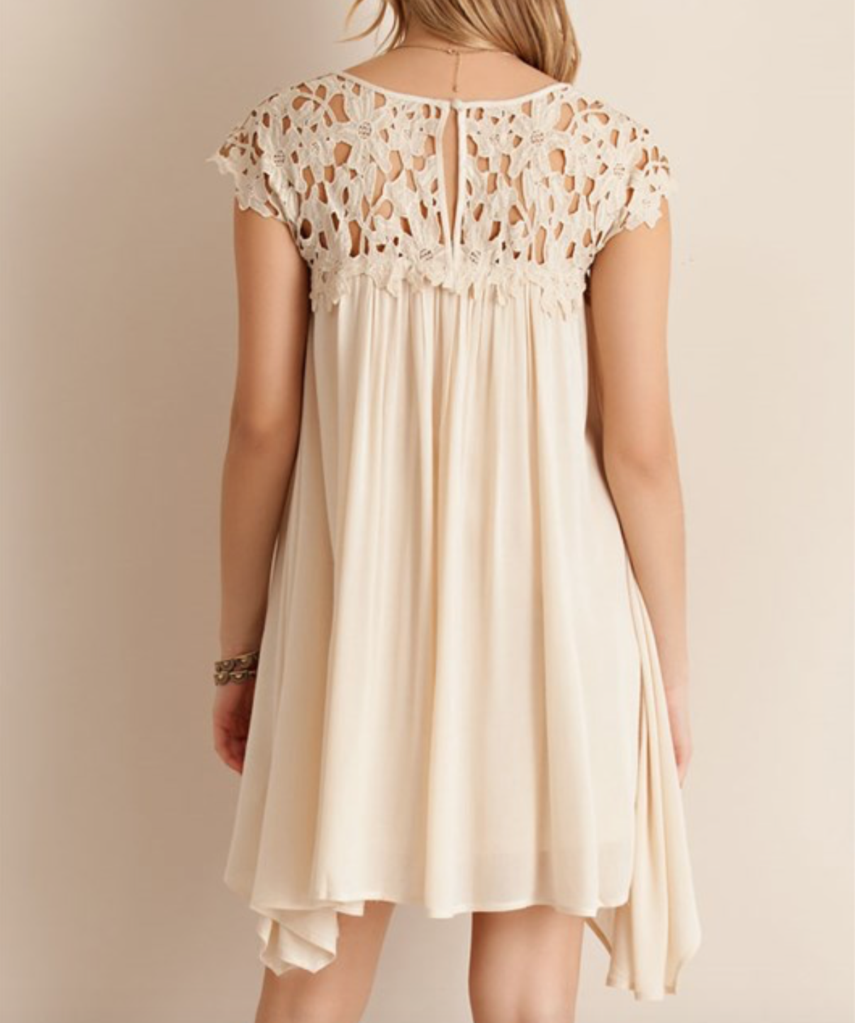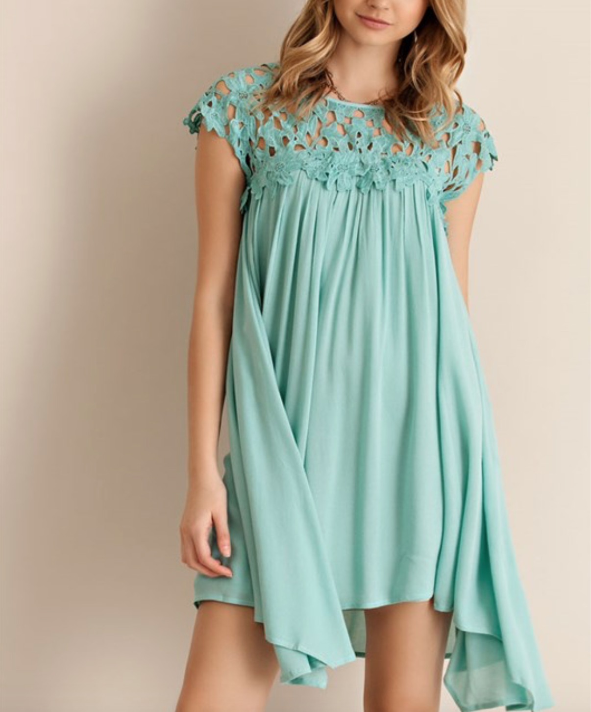 Gorgeous flowy yellow dress that features a pleated front, cap sleeves, and a sheer yoke upper.