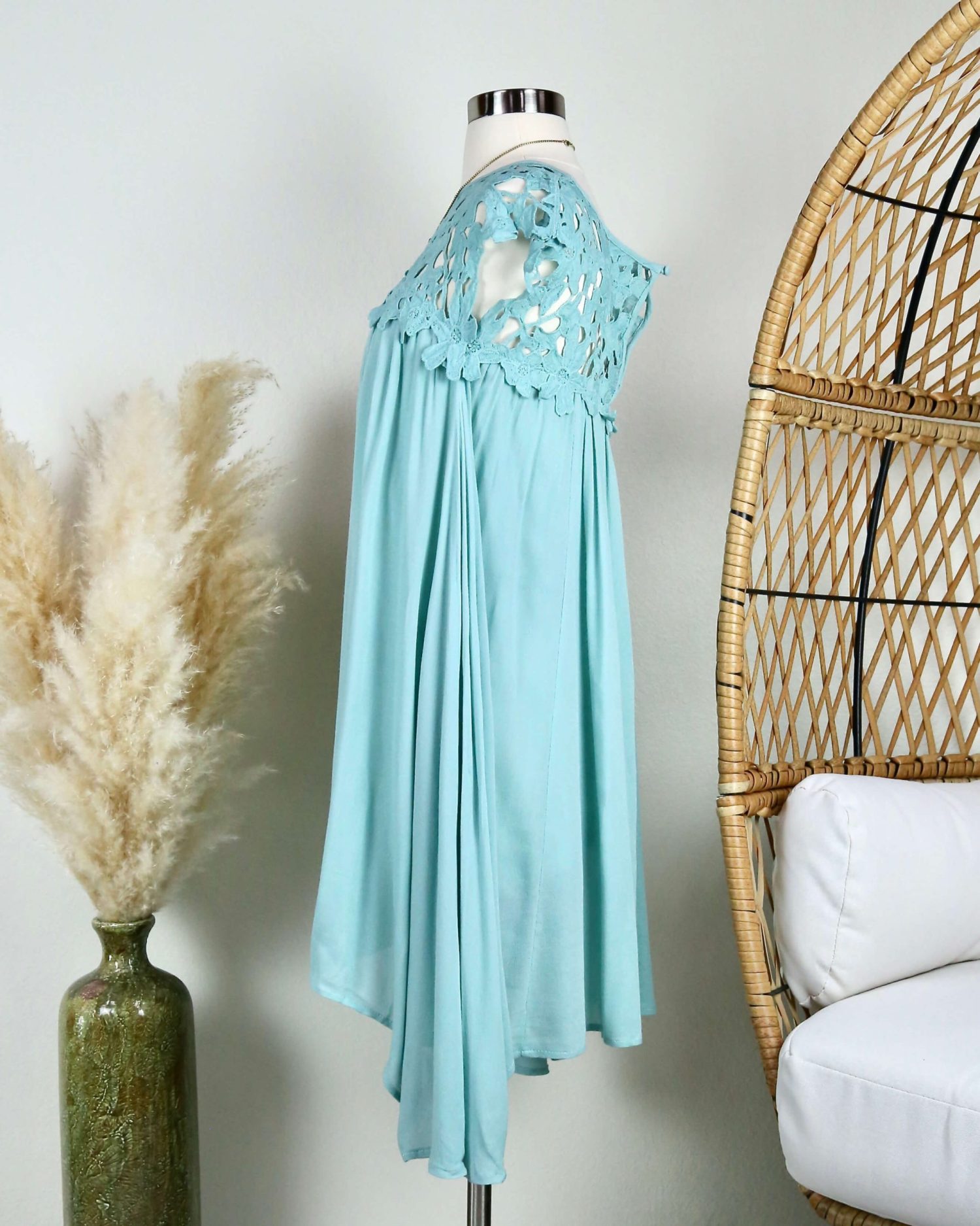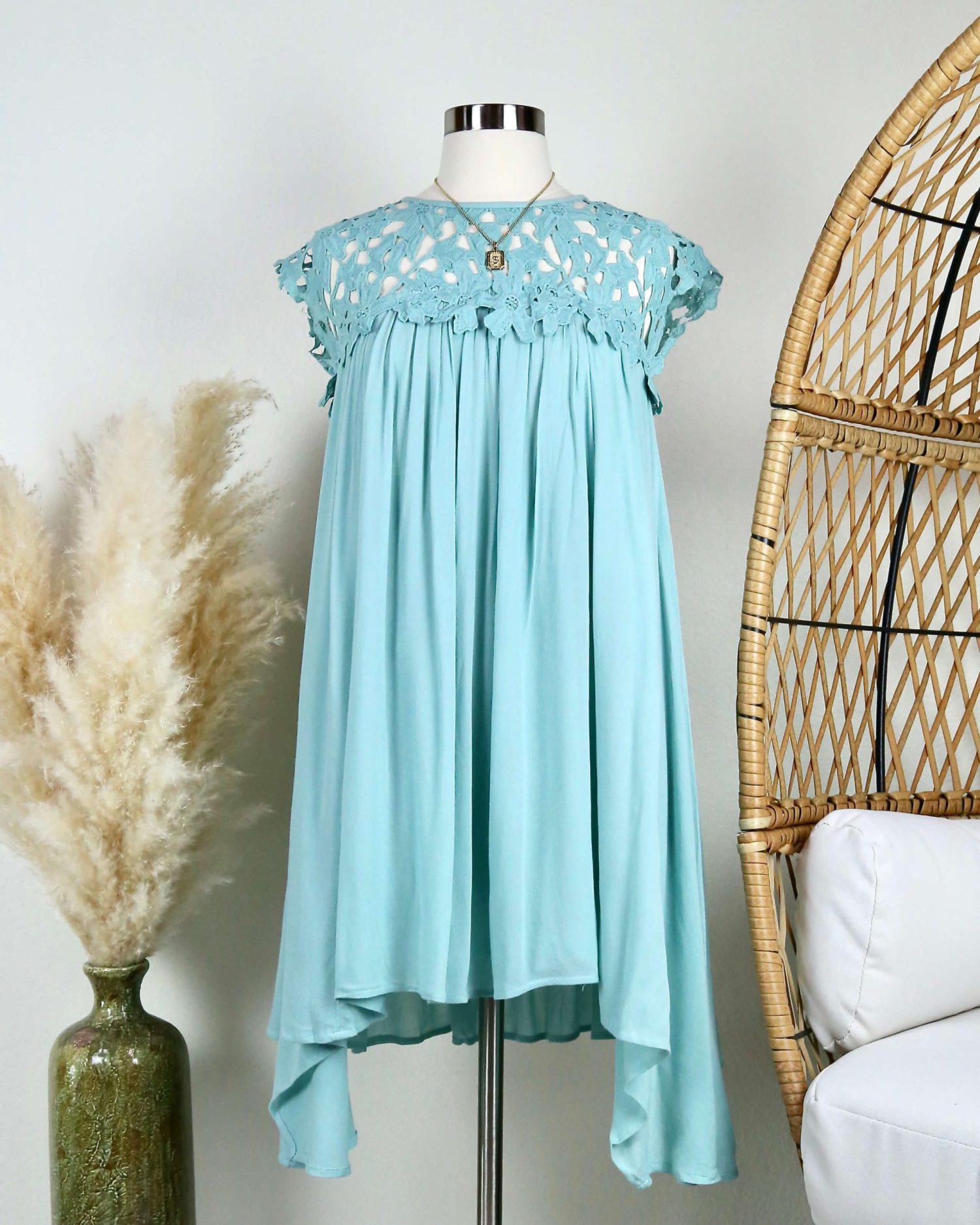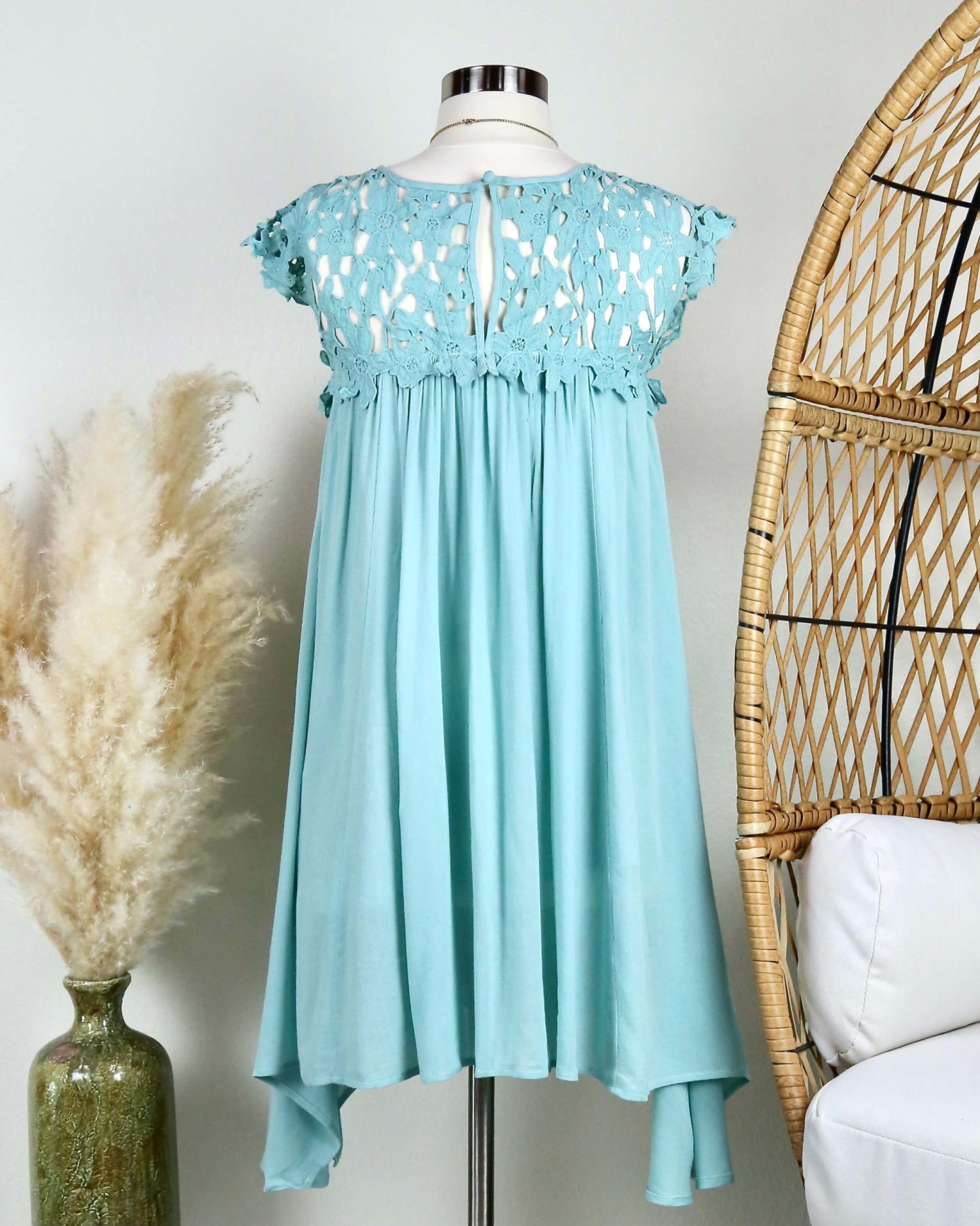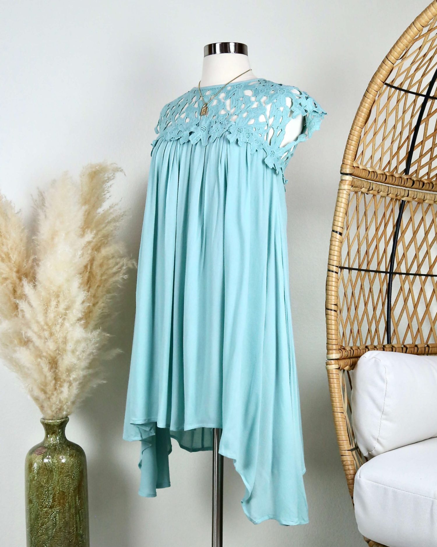 Gorgeous flowy yellow dress that features a pleated front, cap sleeves, and a sheer yoke upper.