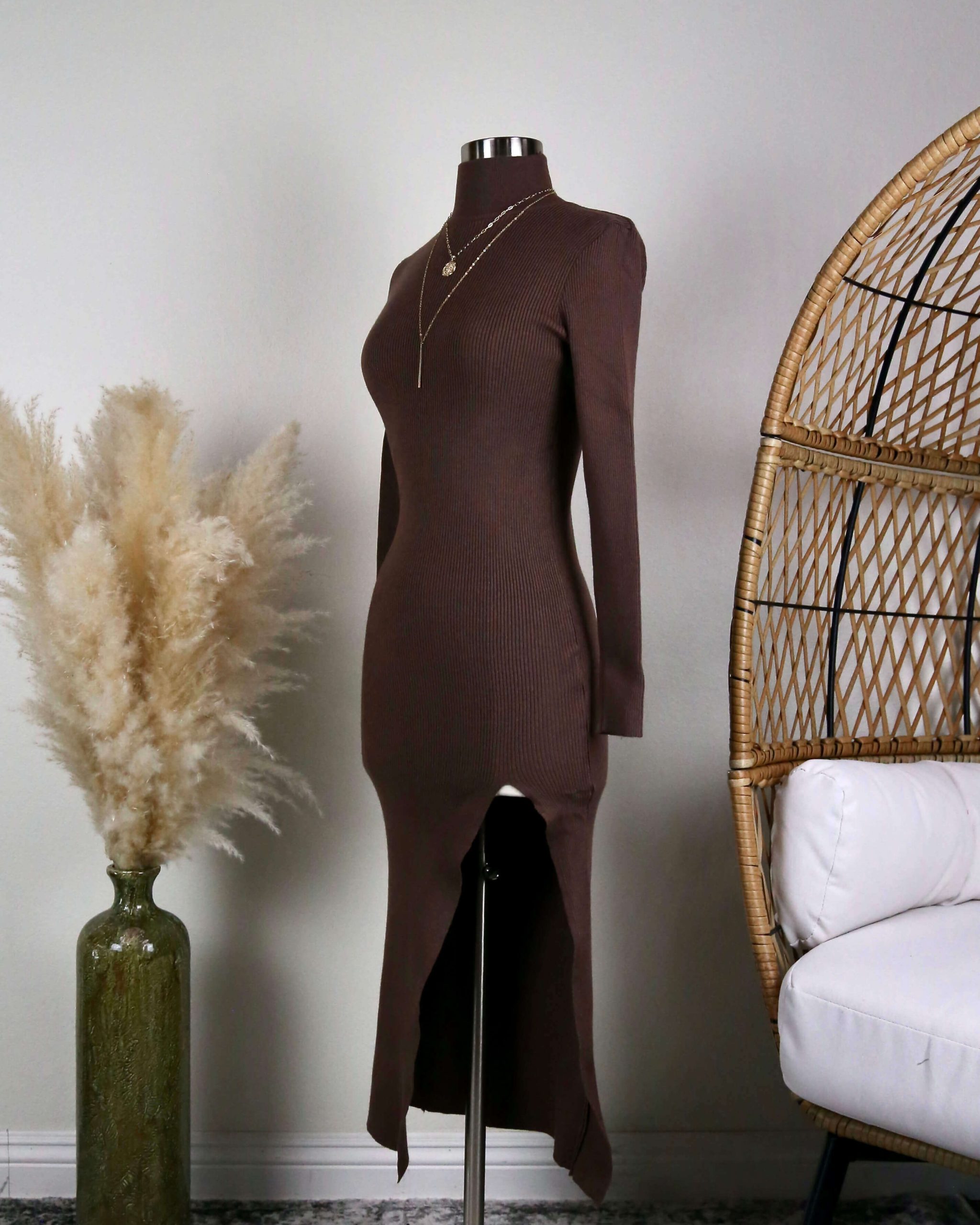 Long Sleeve Ribbed Bodycon Midi Dress With Side Slit in Brown