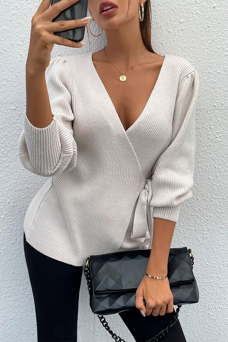 / Sexy V Neck Balloon Sleeve Ribbed Wrap Knit Pullover Sweater